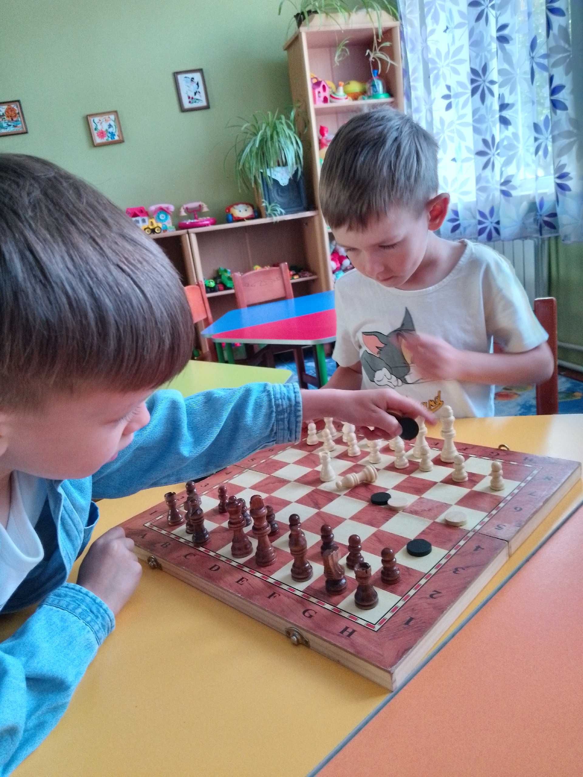 Сьогодні День шахів провели в садочку. Діти ознайомлені з цією грою на гуртку ,але цікаво пограли в шахи та зробили з паперу свої дошки чорно- білі. Розфарбували фігури та вивчили вірш про шахмати