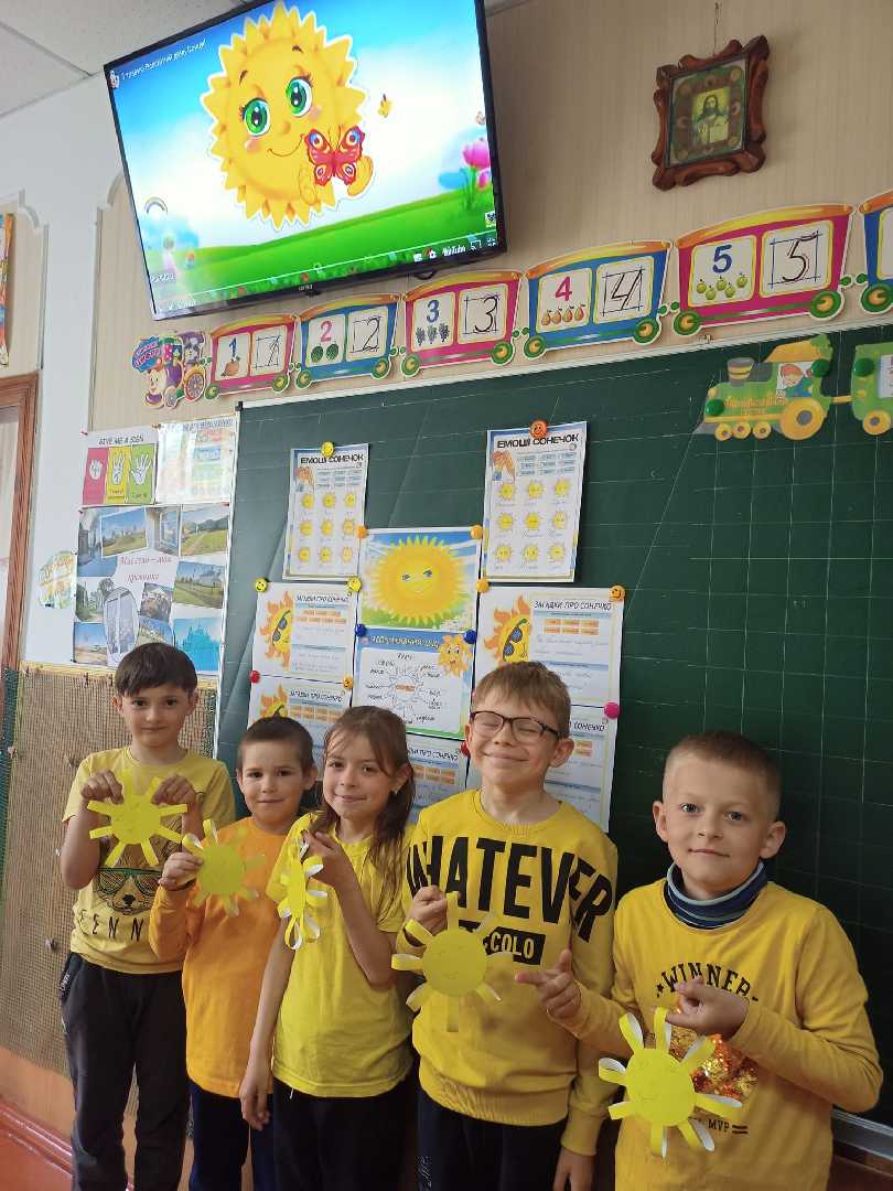 Світить сонце в вишині, Тобі світить і мені. Землю нашу зігріває, Сади світлом наливає. Світить ясно у віконце Золотава зірка — Сонце.
