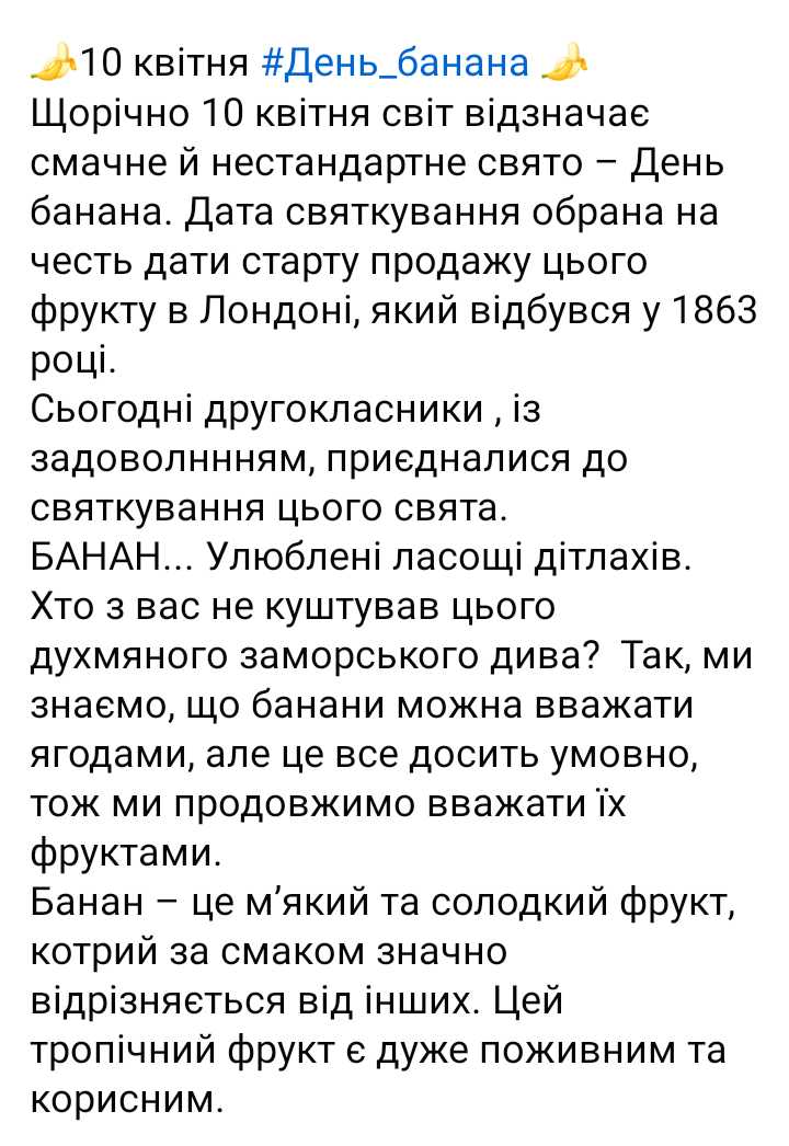 Щорічно 10 квітня світ відзначає смачне й нестандартне свято -День банана. В нашому садочку сьогодні провелося заняття про банани , діти розповіли свої історії про смаки та покупки бананів ,дивилися дитячий фільф та малювали банани.