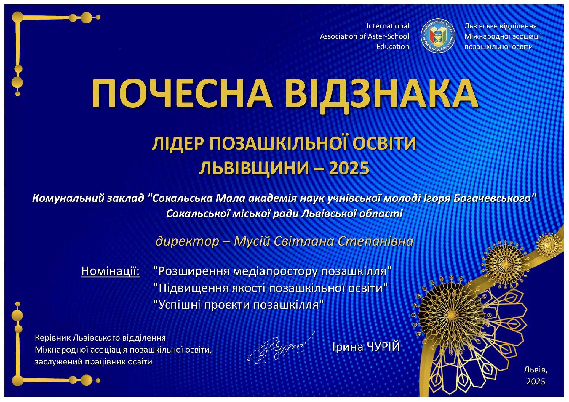 Пишаємось і надихаємось! Високу відзнаку “Лідер позашкільної освіти Львівщини – 2025” вдруге отримав колектив КЗ “Сокальська Мала академія наук учнівської молоді імені Ігоря Богачевського”. Цього року – одразу у трьох номінаціях!!! Це – неймовірний успіх учнів і педагогів закладу.