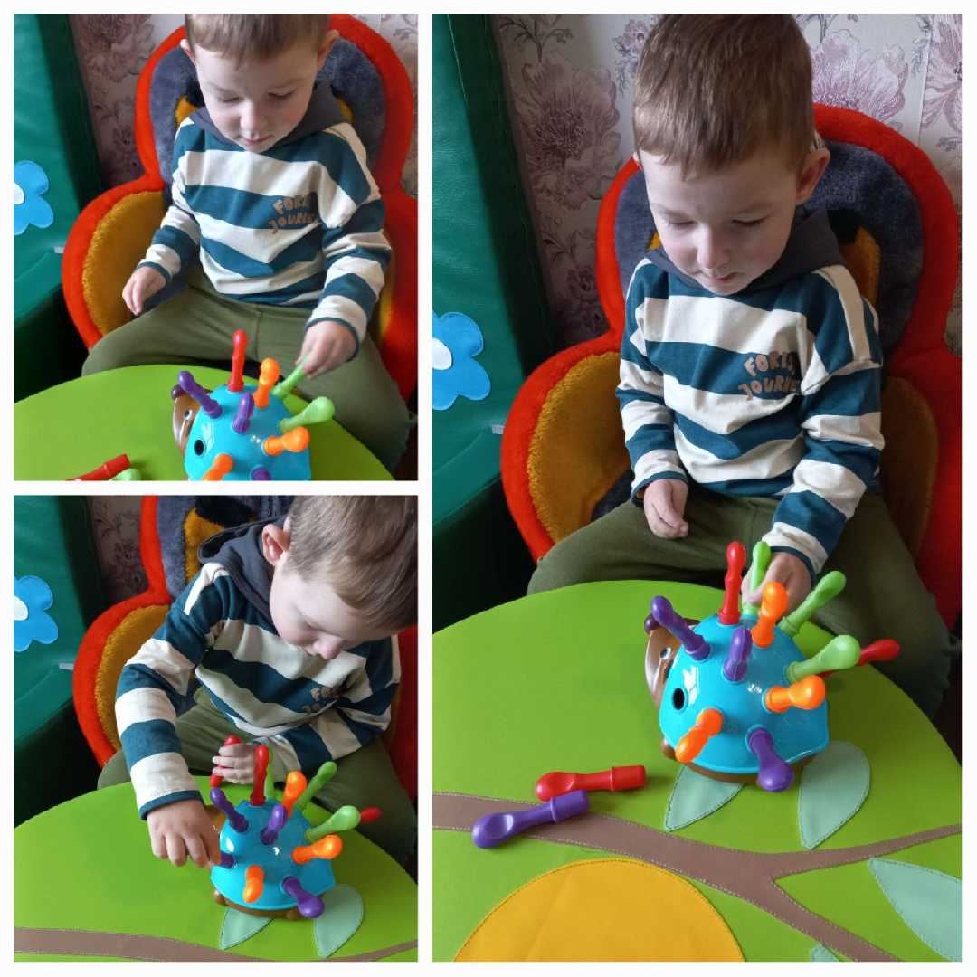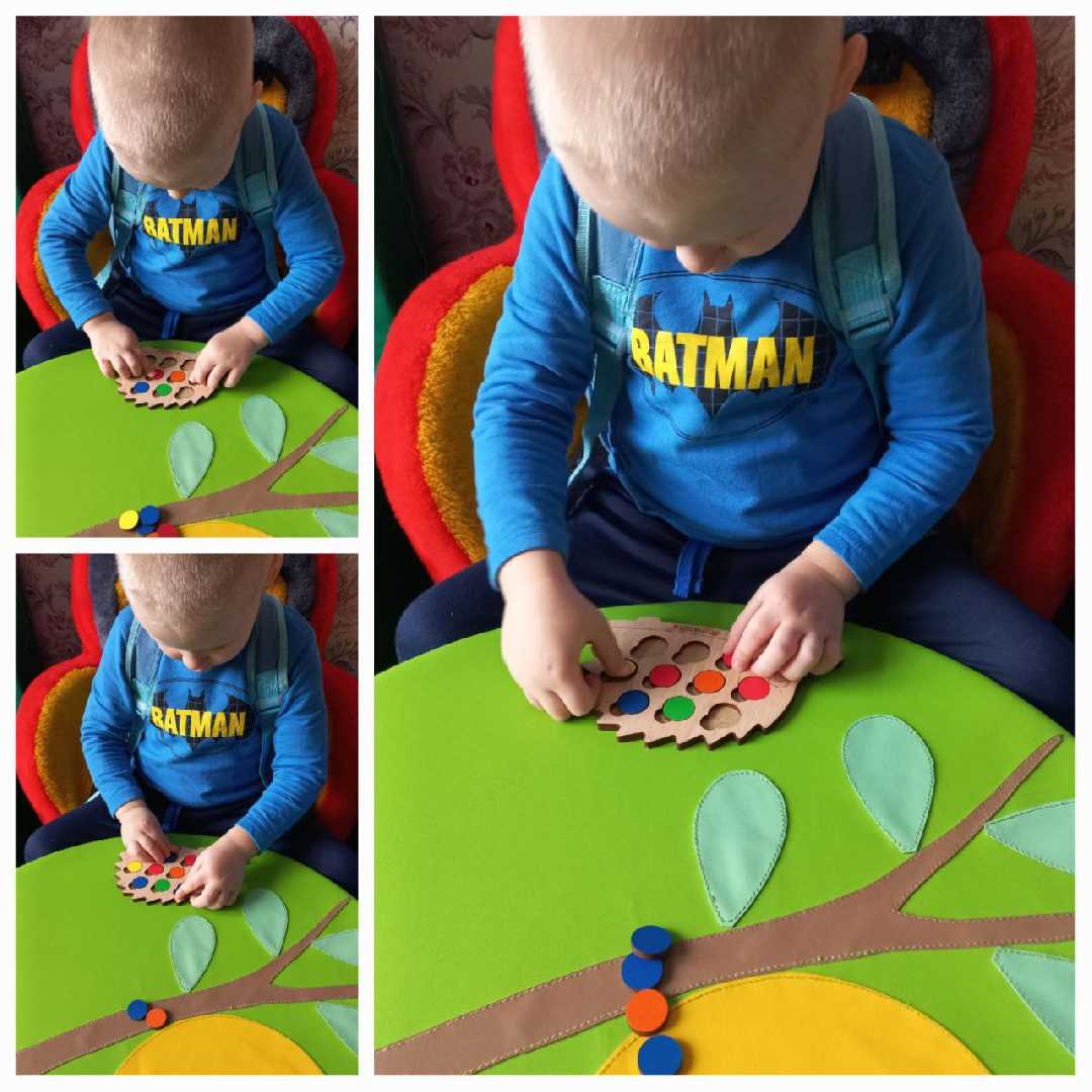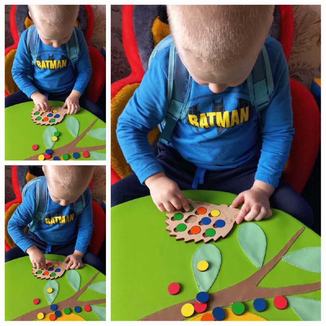 Мета: розвиток дрібної моторики, координації; розрізнення предметів за формою і кольором; концентрація уваги.