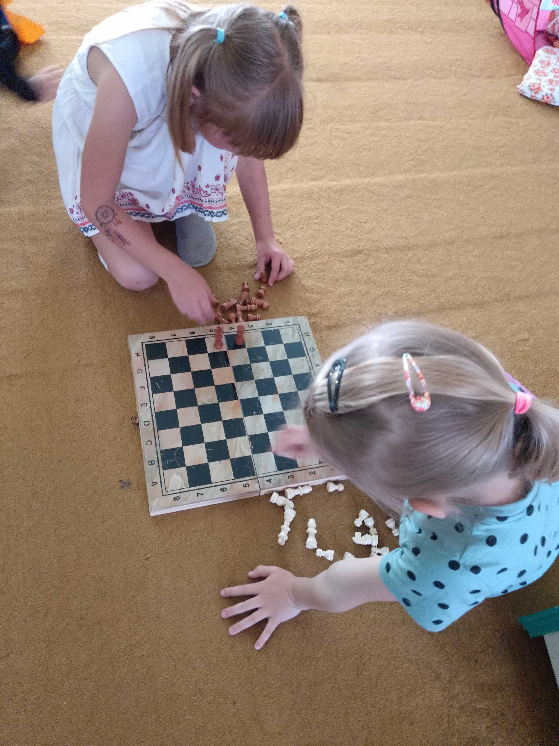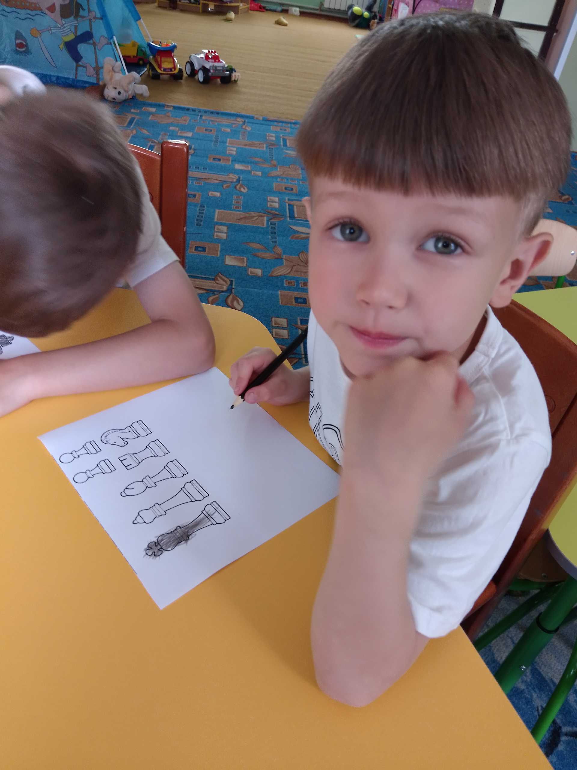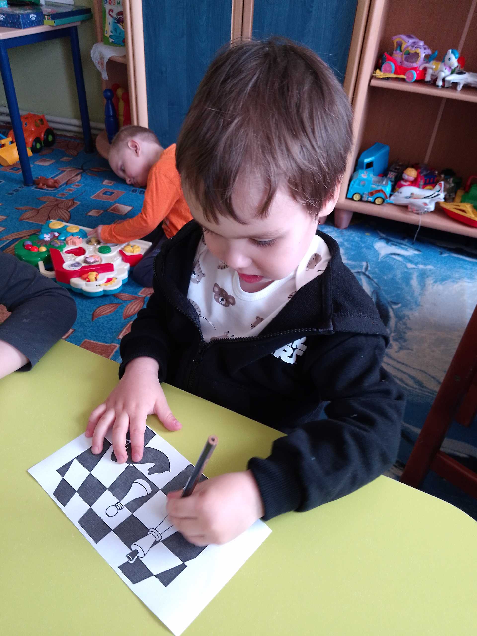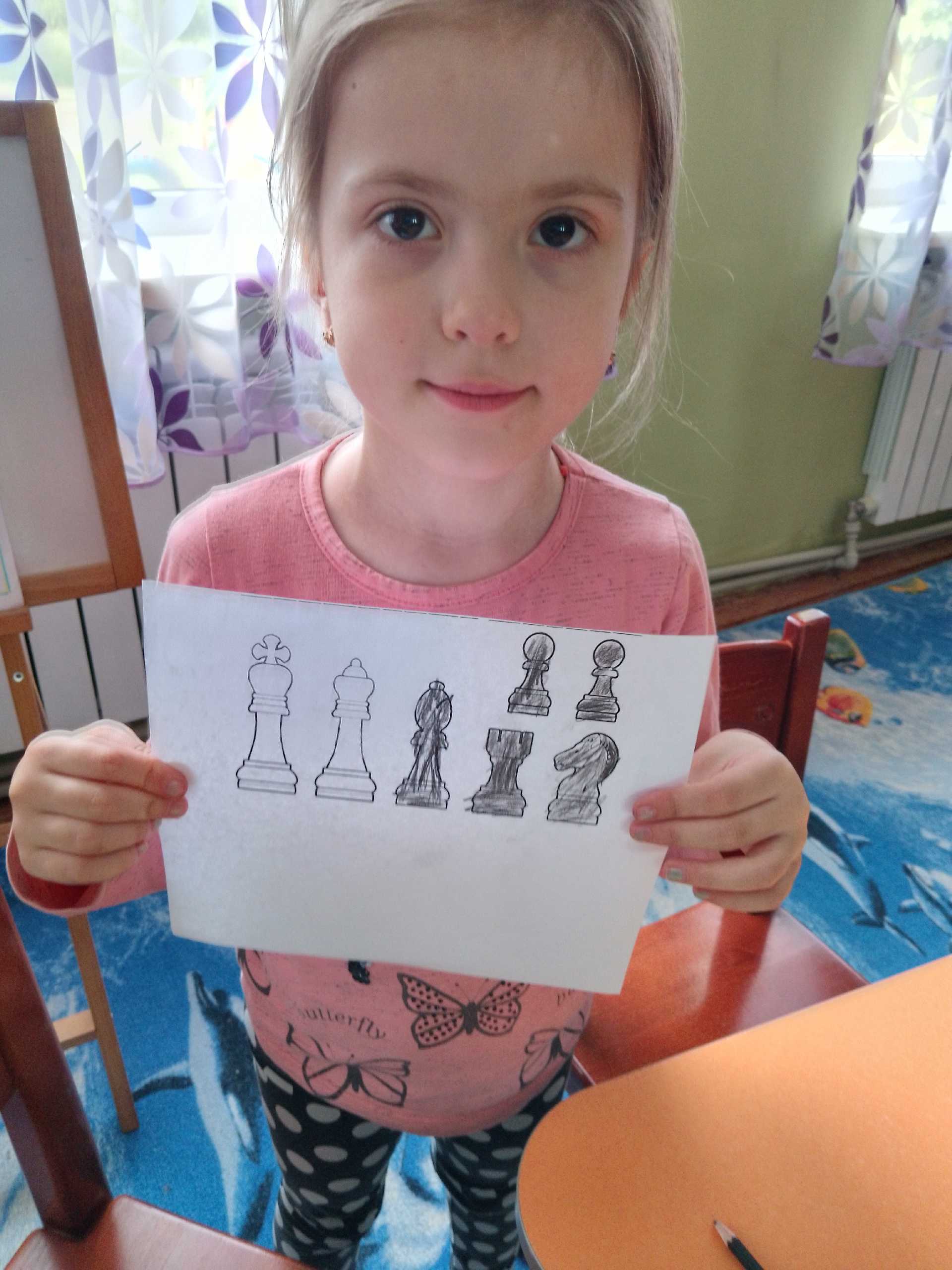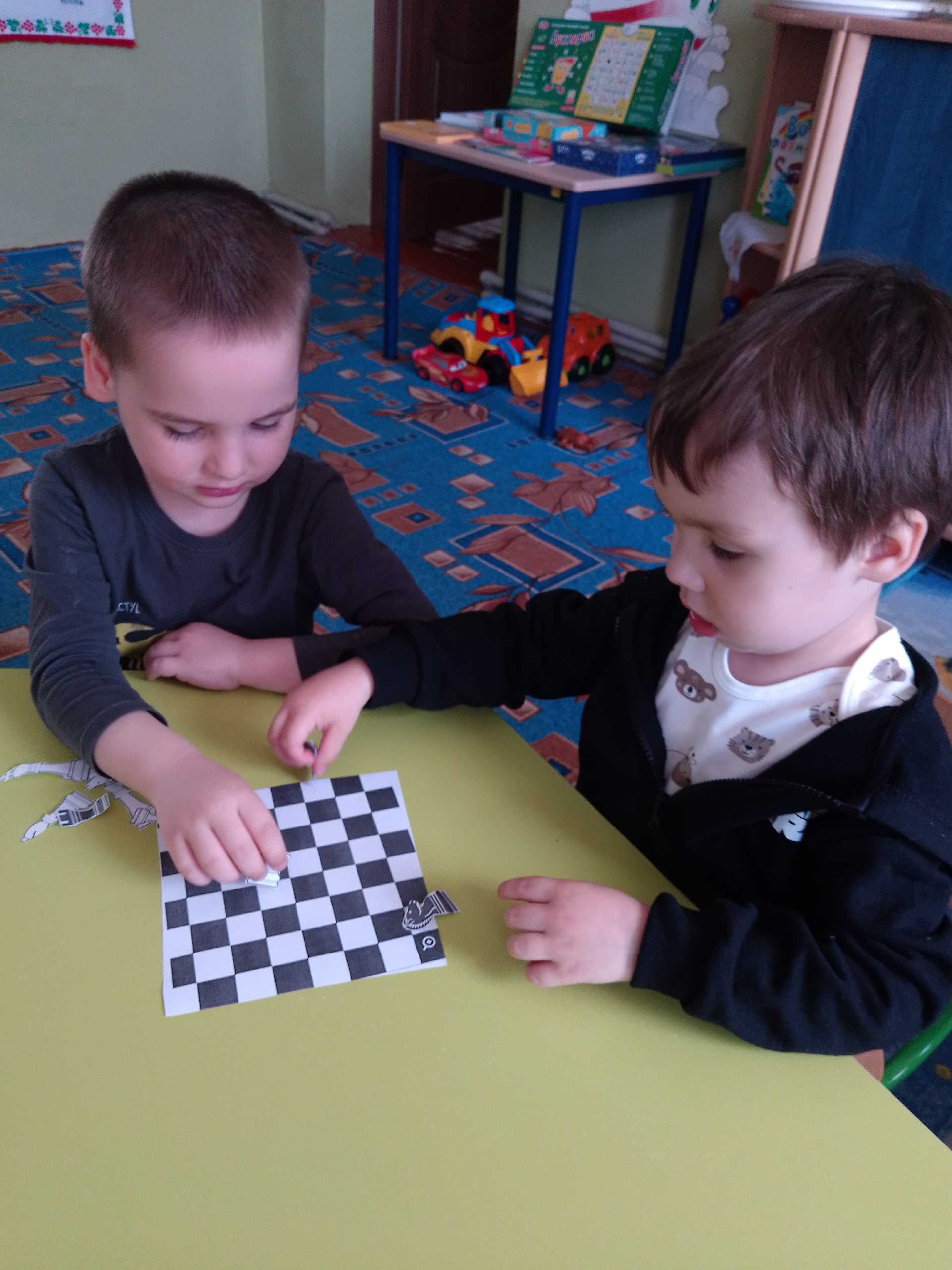 Сьогодні День шахів провели в садочку. Діти ознайомлені з цією грою на гуртку ,але цікаво пограли в шахи та зробили з паперу свої дошки чорно- білі. Розфарбували фігури та вивчили вірш про шахмати