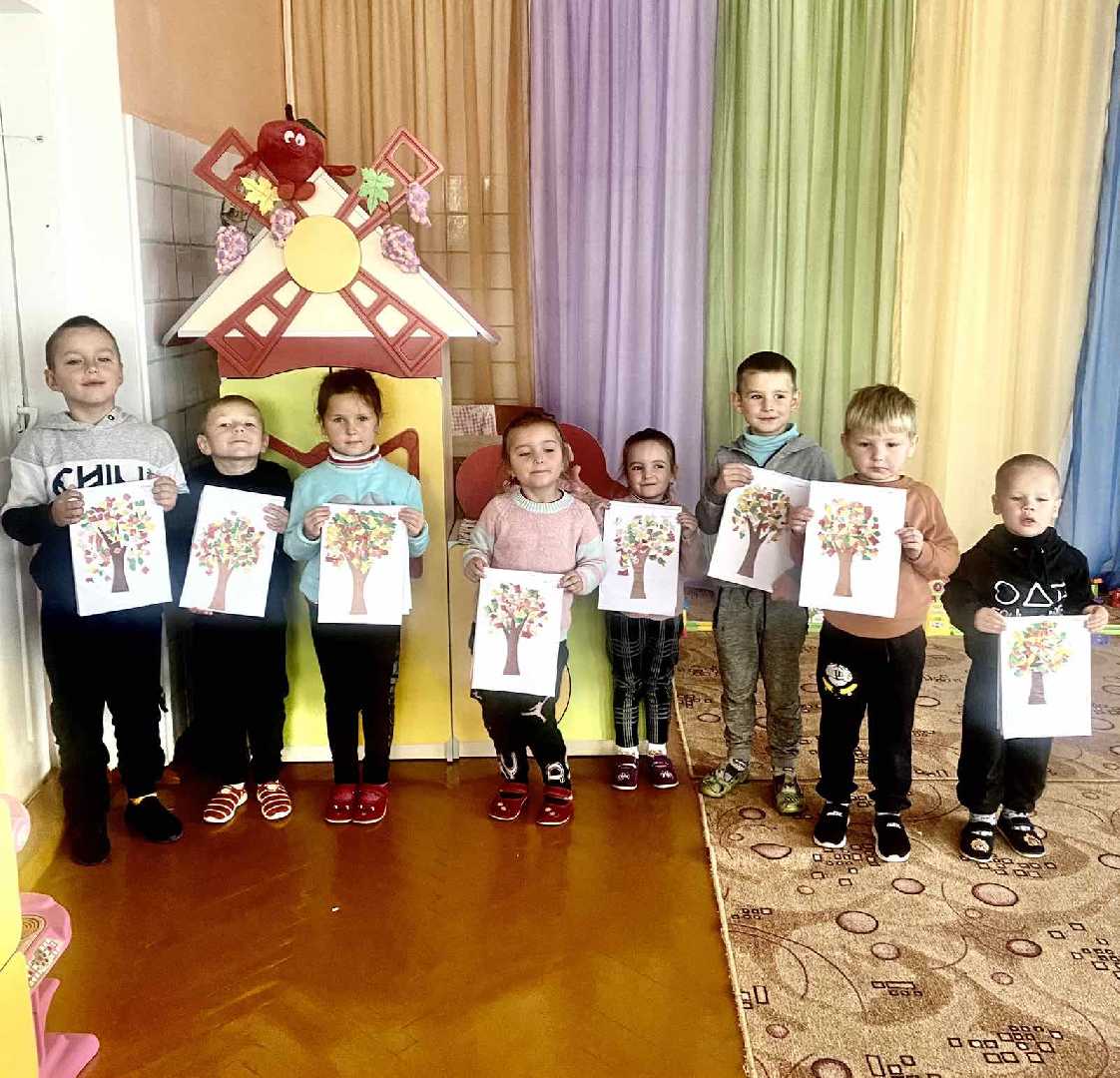 Аплікація «Осіннє вбрання дерев» Формувати вміння дітей бачити красу рідної природи;розвивати вміння створювати композицію,розміщуючи зображення на всій поверхні аркуша;вправляти у вмінні отримувати зображення осіннього листя технікою обривання для «одягання»дерев;навчати прийому аплікації-наносити клей на зображення,прикладати зображення намазаною клеєм стороною до паперу;закріплювати просторове орієнтування «вгорі», «внизу»;розвивати дрібну моторику,творчу уяву.