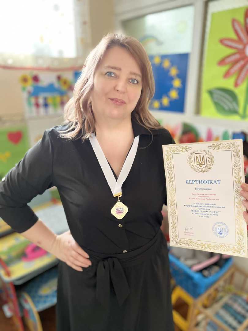 Вітаємо творчого і креативного педагога Наталю Євуш за успішно пройдений Всеукраїнський дистанційний креативний фотопроект « Кращий педагог 2023 року». Вихователь нагороджений медаллю і сертифікатом.