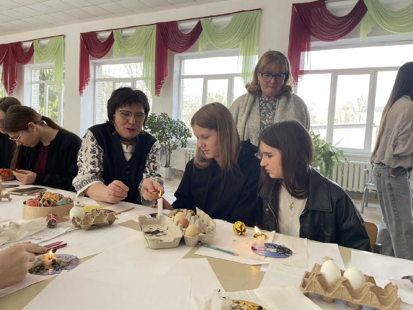 Тут учні 9–10 класів на деякий час змінили підручники та гаджети на воскові свічки та барвники. Для підлітків це була не просто розвага, а справжня арт-терапія. Вони занурилися в історію символіки, виводячи писачком знаки сонця, безконечники та квіти, авторські стилізовані малюнки, що символізують життя і відродження.