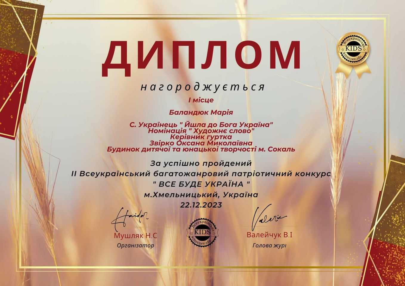 Марічка Баландюк, вихованка гуртка " Зернинка", переможець Всеукраїнського багатожанрового патріотичного конкурсу "Все буде Україна".
