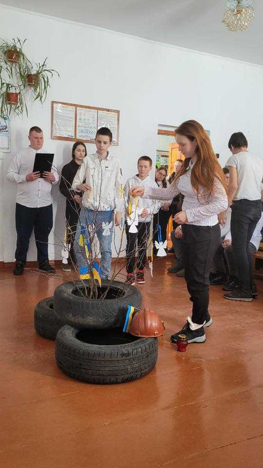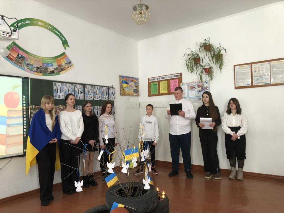 Разом з учнями ми провели годину пам’яті. Діти з великою повагою та серйозністю тримали Державний Прапор України, запалили свічки пам’яті та вшанували загиблих хвилиною мовчання. Символічна композиція з янголами, синьо-жовтими стрічками, лампадками й каскою нагадала про крихкість життя та високу ціну свободи.