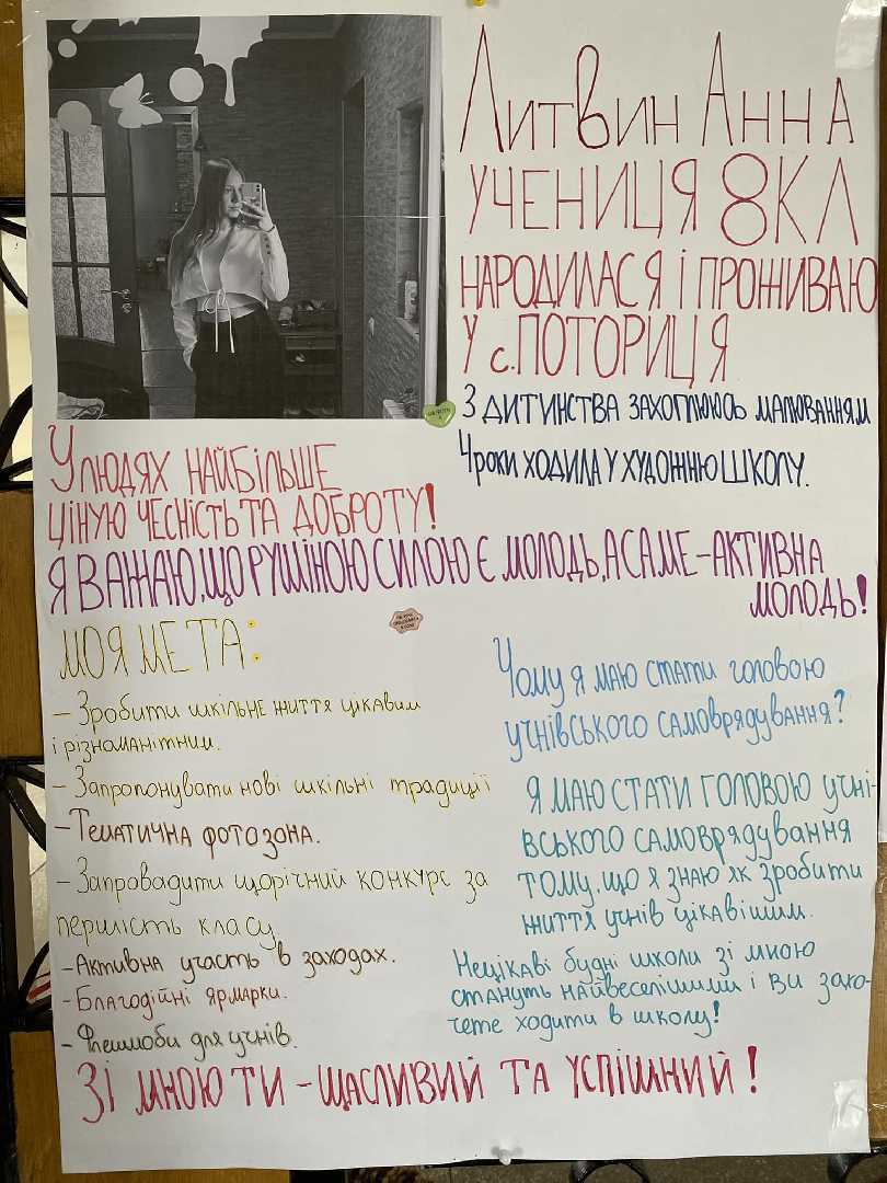 Раді оголосити, що головою учнівського самоврядування стала Литвин Анна, учениця 8 класу. Вона отримала підтримку більшості учнів та перемогла з відривом у 6 голосів.