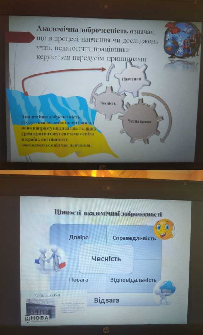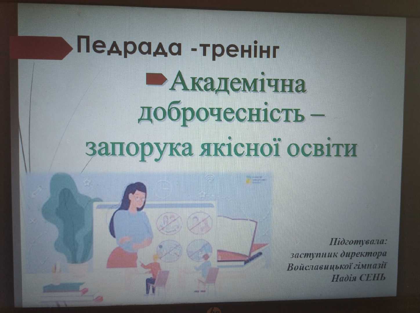 27 березня у Войславицькій гімназії відбулося засідання педагогічної ради у формі тренінгу “Академічна доброчесність – запорука якісної освіти». Мета педради: актуалізація та поглиблення знань педагогічних працівників про академічну доброчесність, її принципи, механізми забезпечення в сучасному закладі освіти. Заступник директора Сень Н.Д. ознайомила учасників педради з інформаційними заходами із формування академічної доброчесності та попередження фактів її порушення, видами відповідальності за порушення академічної доброчесності та порядком реагування на виявлені випадки академічної недоброчесності. Під час тренінгу вчителі у групах взяли активну участь у різноманітних інтерактивних вправах щодо формування академічної доброчесності в освітньому процесі. Педагогічний колектив, в обговореннях , шукав шляхи формування у здобувачів освіти чітких орієнтирів до сталого успіху. Обмін досвідом й творча атмосфера надихали вчителів до пошуку своїх шляхів продуктивного навчання.