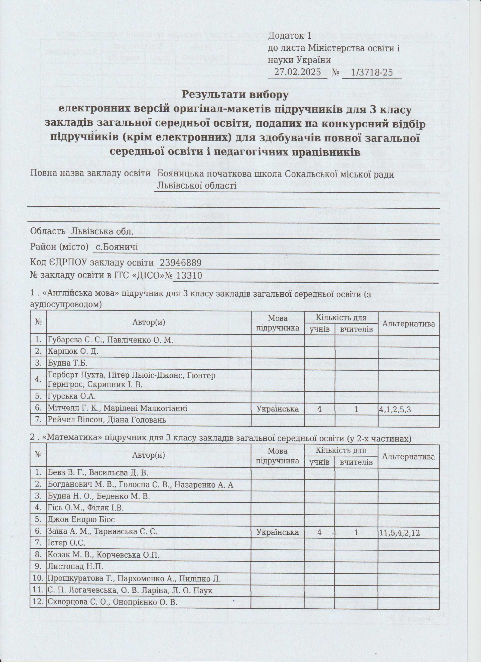 Директора закладу Дмитрів Л.Г., яка ознайомила педагогічний колектив з листом МОН від 27.02.2025 №1/3718-25 «Про забезпечення проведення конкурсного відбору підручників (крім електронних) для здобувачів повної загальної середньої освіти і педагогічних працівників у 2024-2025 роках (1,2,3 та 8 класи)» та з метою організації прозорого вибору закладами загальної середньої освіти підручників для 3 класу Нової української школи, що можуть видаватися державним коштом.