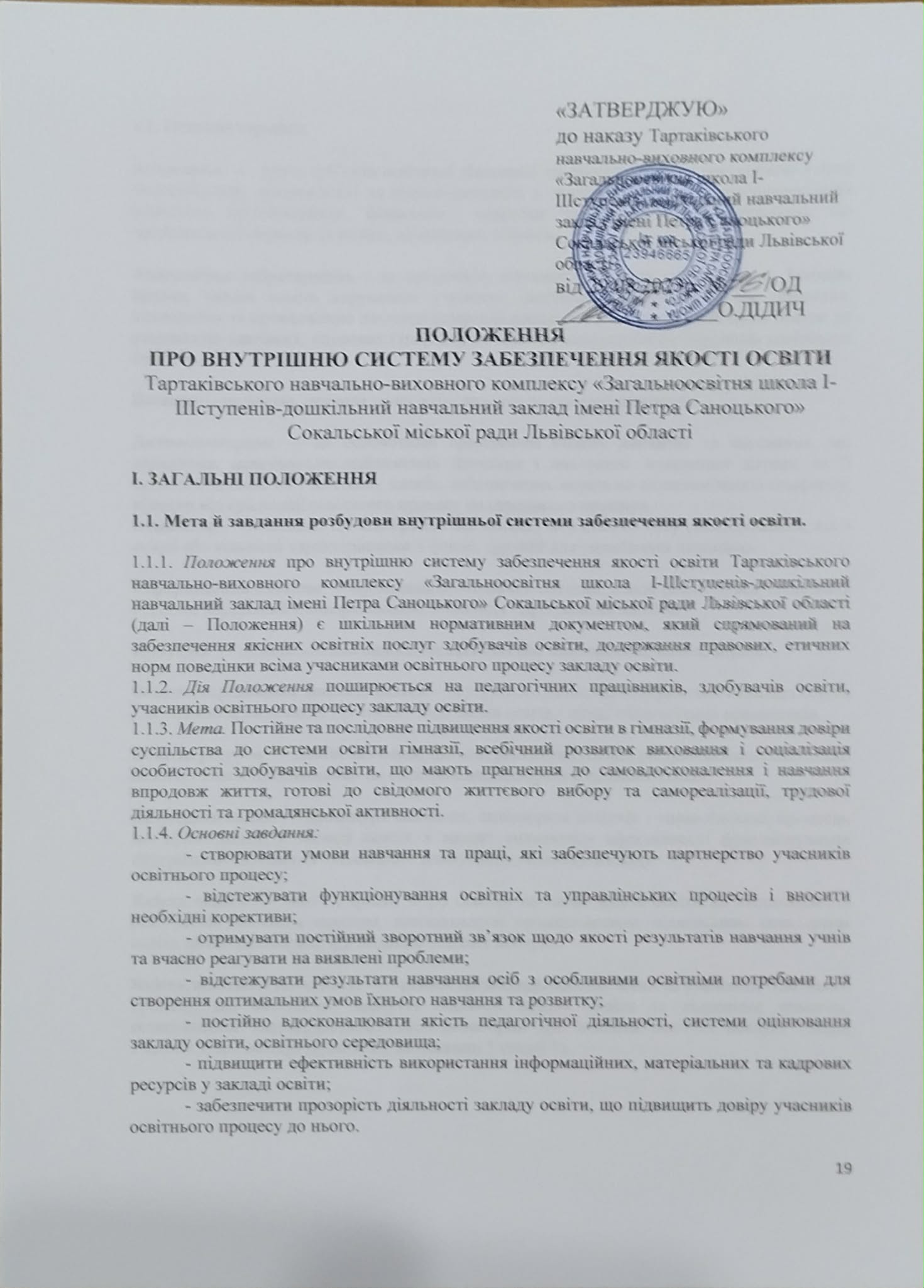 1.1.1. Положення про внутрішню систему забезпечення якості освіти Тартаківського навчально-виховного комплексу «Загальноосвітня школа І-ІІІступенів-дошкільний навчальний заклад імені Петра Саноцького» Сокальської міської ради Львівської області (далі – Положення) є шкільним нормативним документом, який спрямований на забезпечення якісних освітніх послуг здобувачів освіти, додержання правових, етичних норм поведінки всіма учасниками освітнього процесу закладу освіти.