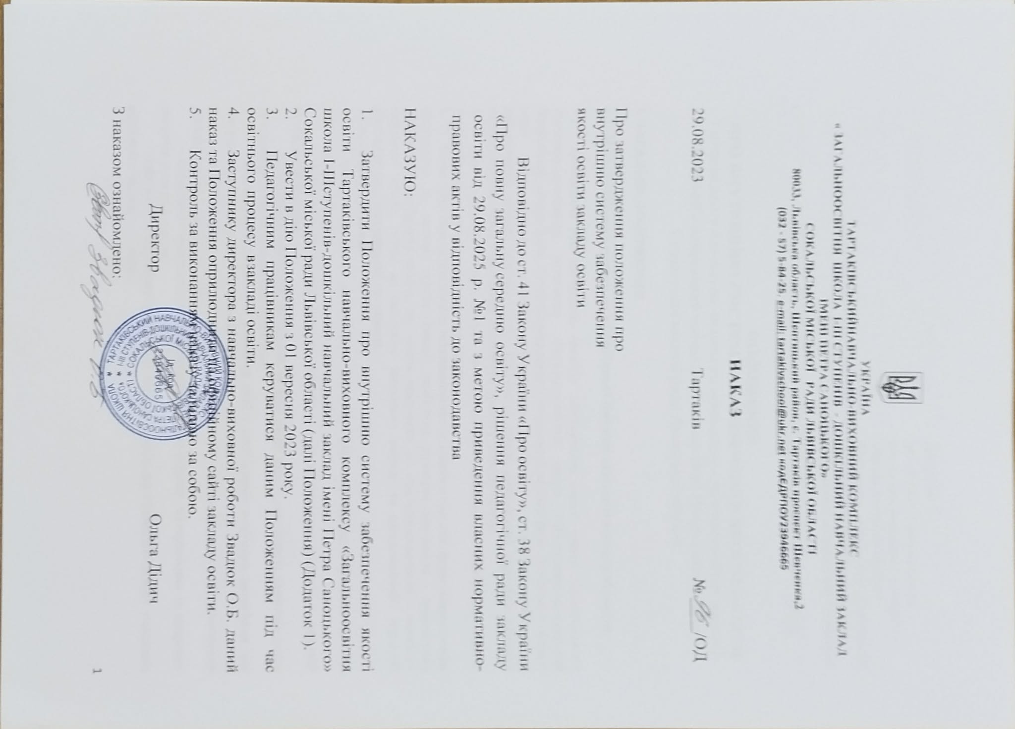наказ Тартаківського навчально-виховного комплексу «Загальноосвітня школа І-ІІІступенів-дошкільний навчальний заклад імені Петра Саноцького» Сокальської міської ради Львівської області