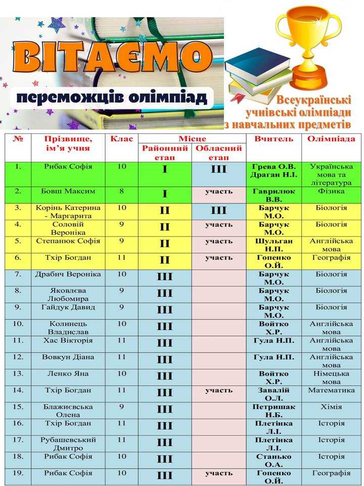 У 2025/2026 навчальному році учні Сокальської загальноосвітньої школи І-ІІІ ступенів показали хороші результати на І (районному) етапі та ІІ (обласному) етапі Всеукраїнських учнівських олімпіад з навчальних предметів. І ета ...